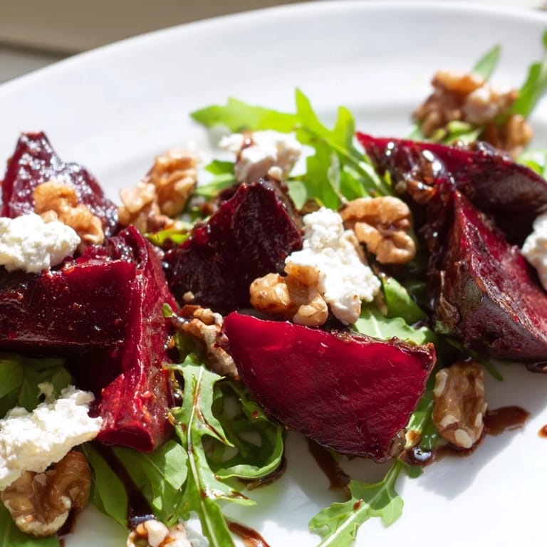 - Pile the arugula into a large salad bowl and scatter the roasted beet pieces, crumbled goat cheese, and toasted walnuts over the top in a way that looks casual but actually took you three tries to get right. Drizzle the dressing over everything and toss gently with your hands or two spoons so the goat cheese doesn't completely disintegrate.